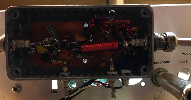 The DDS output is fairly low-level. A bandpass filter follows the DDS chip, and